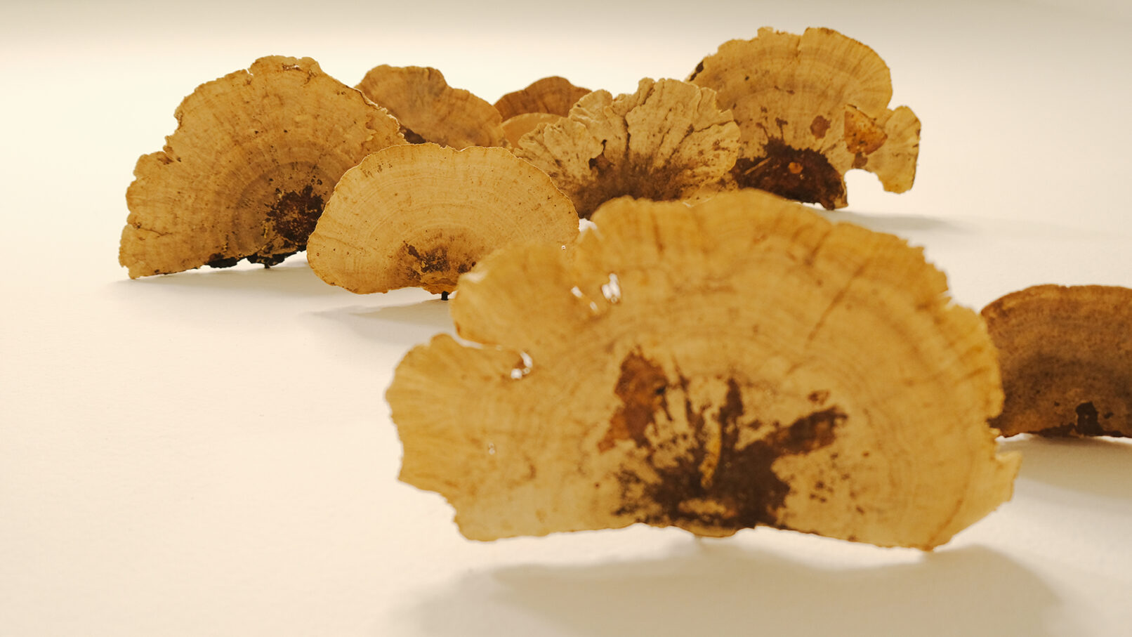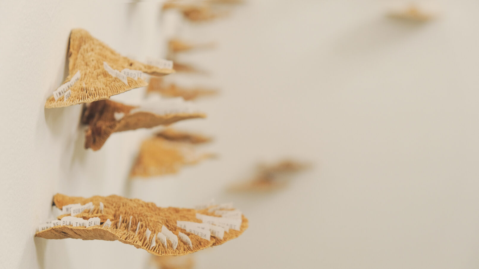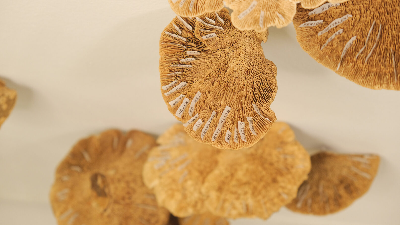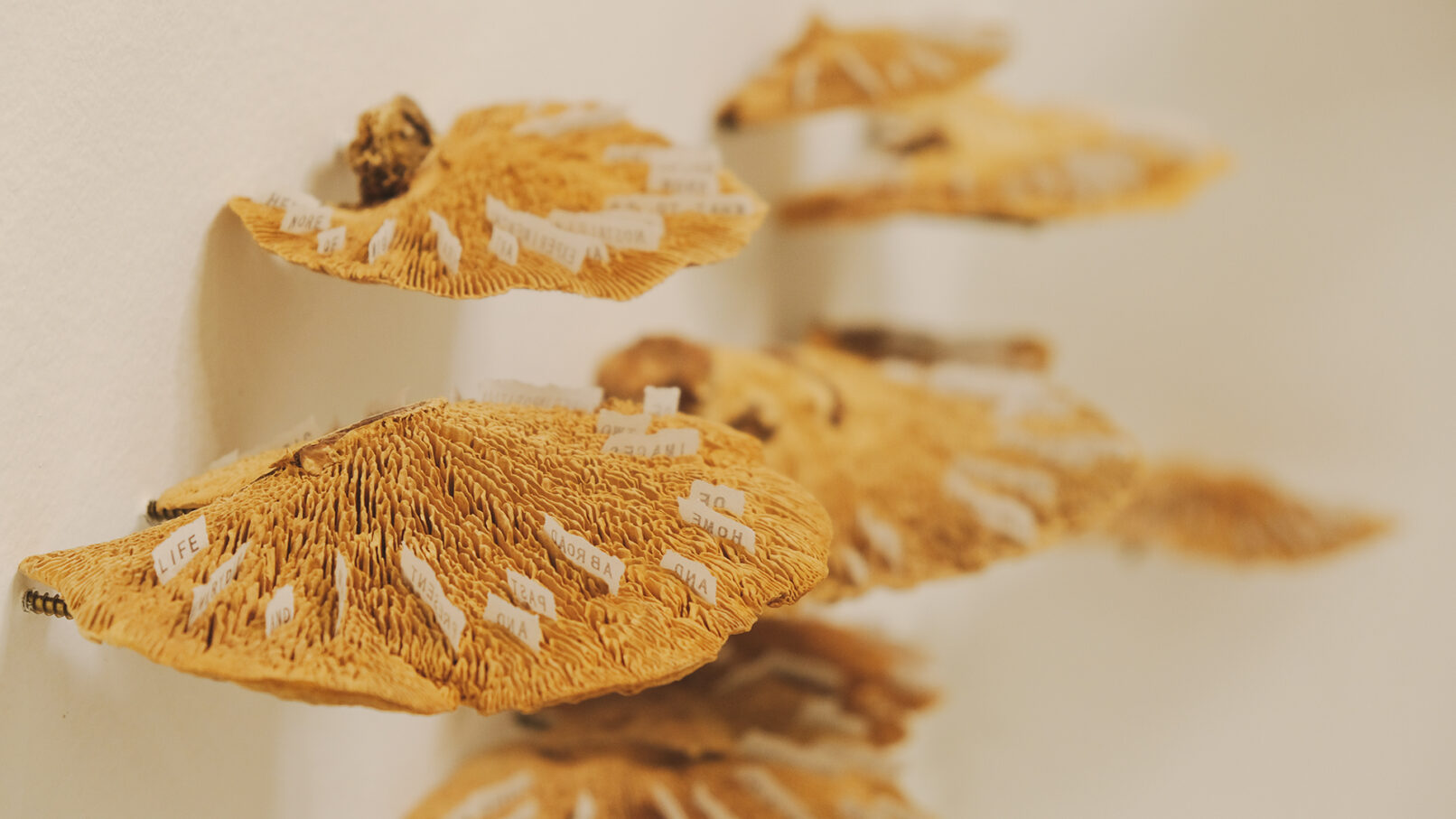 「海綿樹菇雕塑」的概念,是來自經常漏水的台灣老家,在雨季來臨時牆壁上不只潮濕發霉,甚至還長過香菇。此計畫利用菇菌類這種介於植物與動物之間、 介於腐敗與重生之間的媒介,表達在被遺忘和凋零的記憶裡角落裡,透過文字重生的意象。海綿樹菇雕塑裡頭的文字,是來自過去兩年多在創作《三個太陽》出版計畫的期間,啟發作品概念的閱讀蒐集。把文字手工印置在古董打字機使用的半透明洋蔥皮紙上,再安插入倒置的乾燥海綿樹菇裡,將文字像菇菌的孢子一樣呈現,在角落裡默默地散播和繁衍。