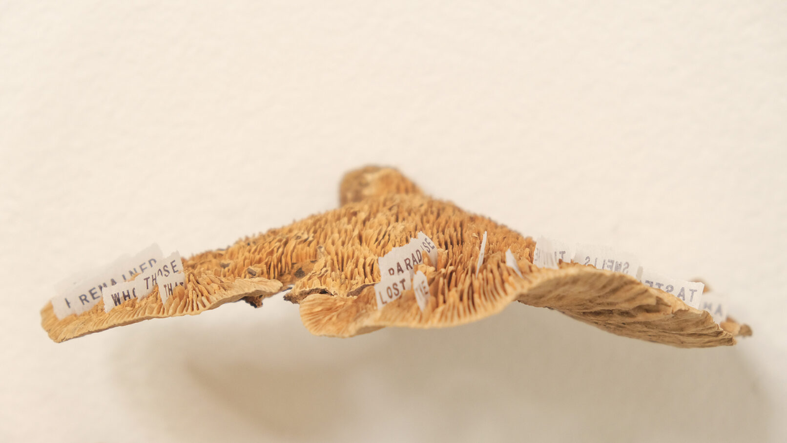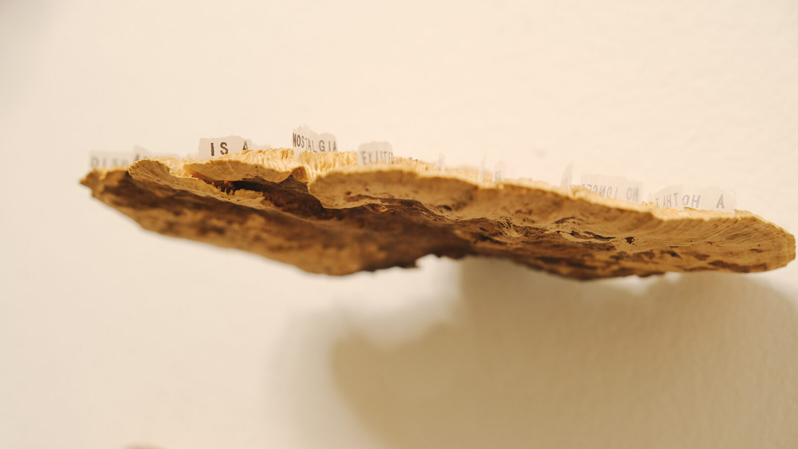 The sponge mushroom sculpture was inspired by my childhood home in Taiwan. When the rainy season comes the walls are not only damp and moldy, but mushrooms also grow. This project uses mushrooms, a medium between plants and animals, between death and life, to express the imagery of rebirth through words in the corners of forgotten and withered memories.