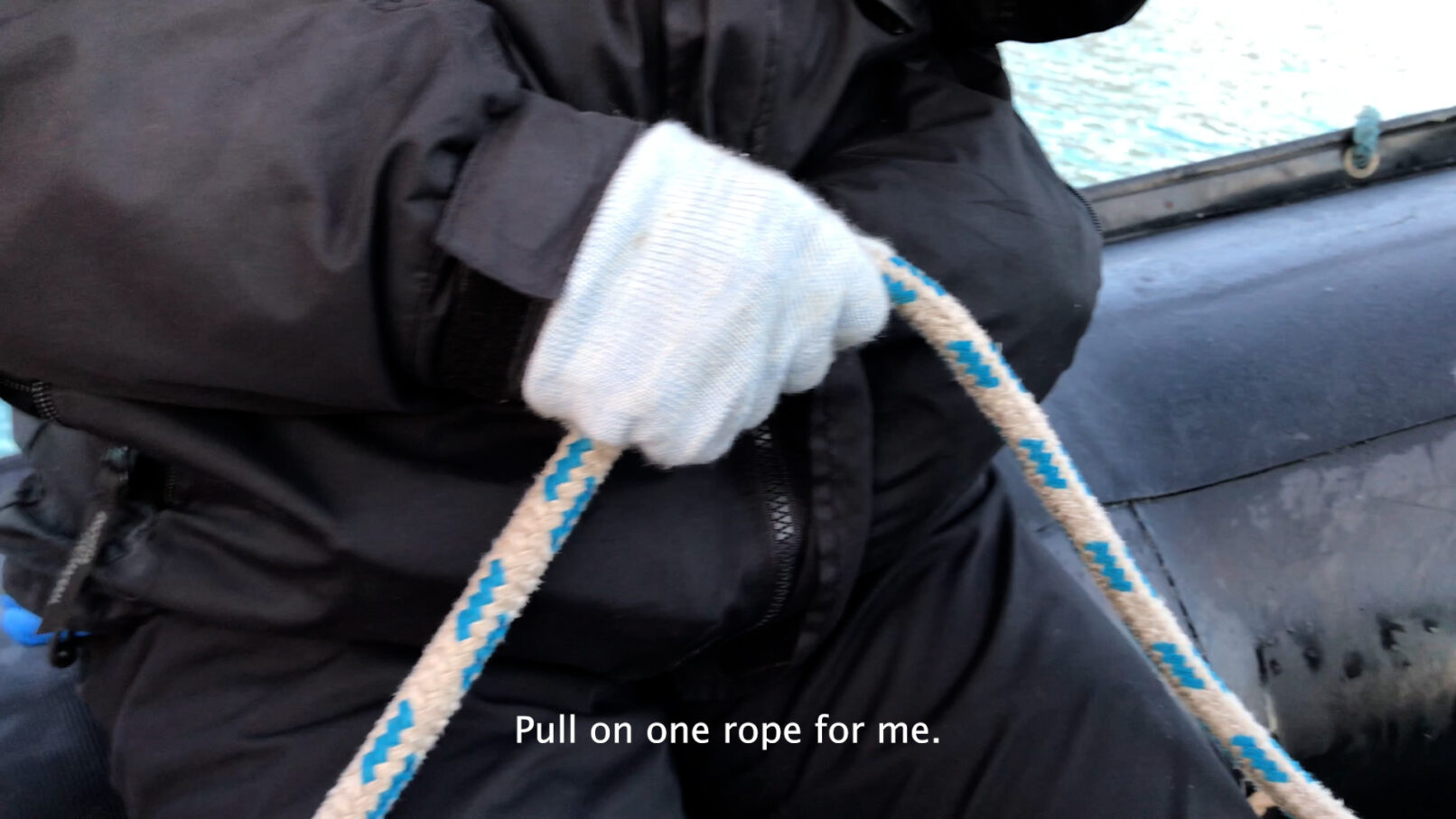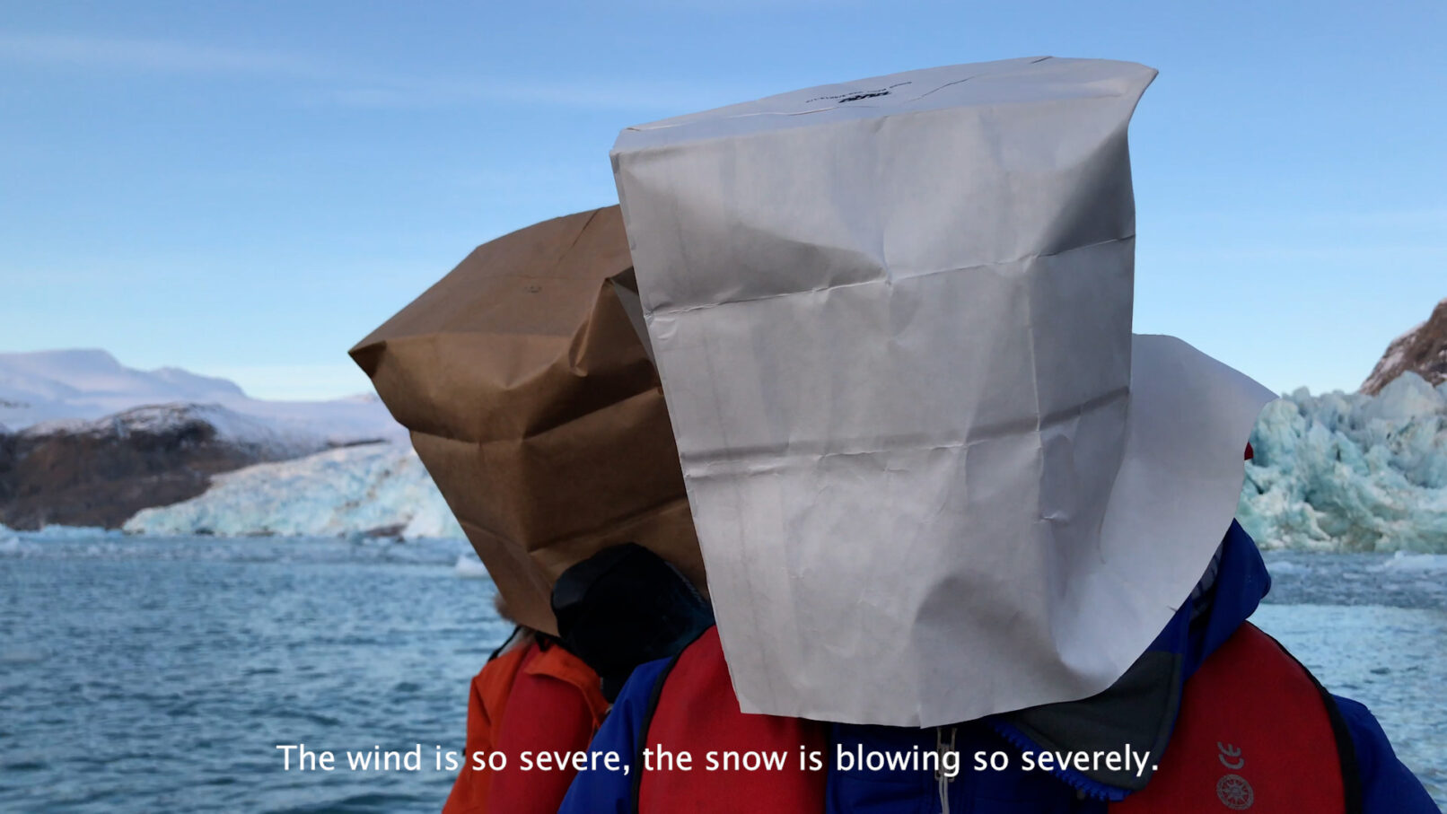 2017年在北極圈駐村期間,我以韋納.荷索《在世界盡頭相遇》紀錄片中,協力搜尋失散夥伴的訓練片段作為啟發,邀請9位來自國際的同行團員,在頭部套上紙袋,模擬嚴酷極地大風雪中受限的視線和聽覺,於橡皮艇上和冰川邊緣,靠著一條繩索溝通、生存。這場表演以團員在冰川裂隙前跌跤作結,如同紀錄片裡的訓練,到底還是迷失了方向,沒有達成救援目的便告終。並利用紀錄片裡的訓練過程的部分對話,與極地表演片段對應呈現,意圖展示「現代極地探險」潛在的荒誕性。