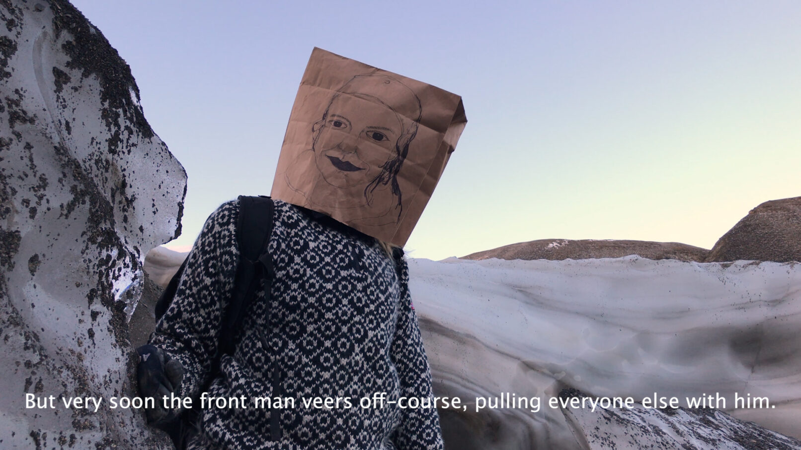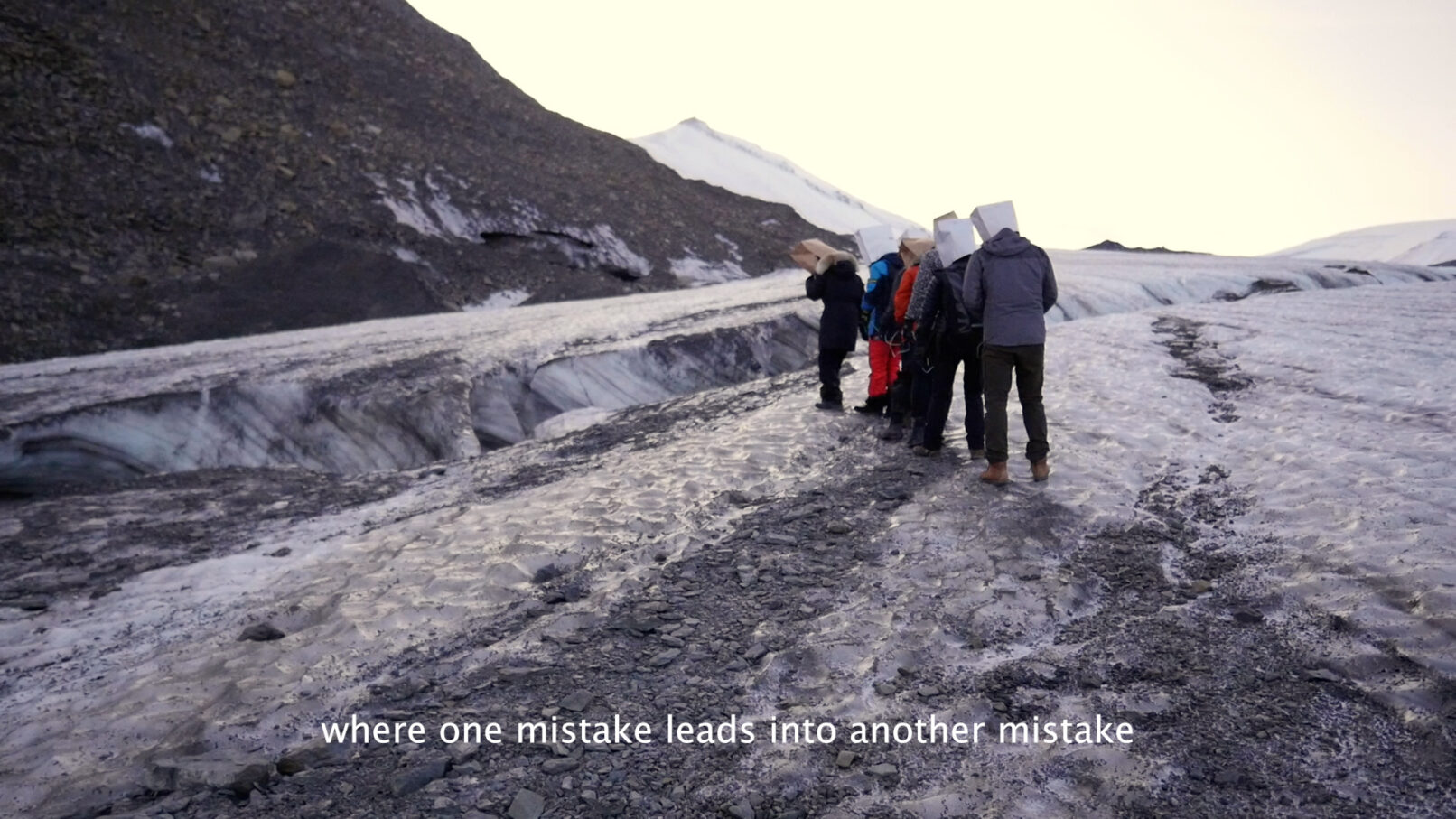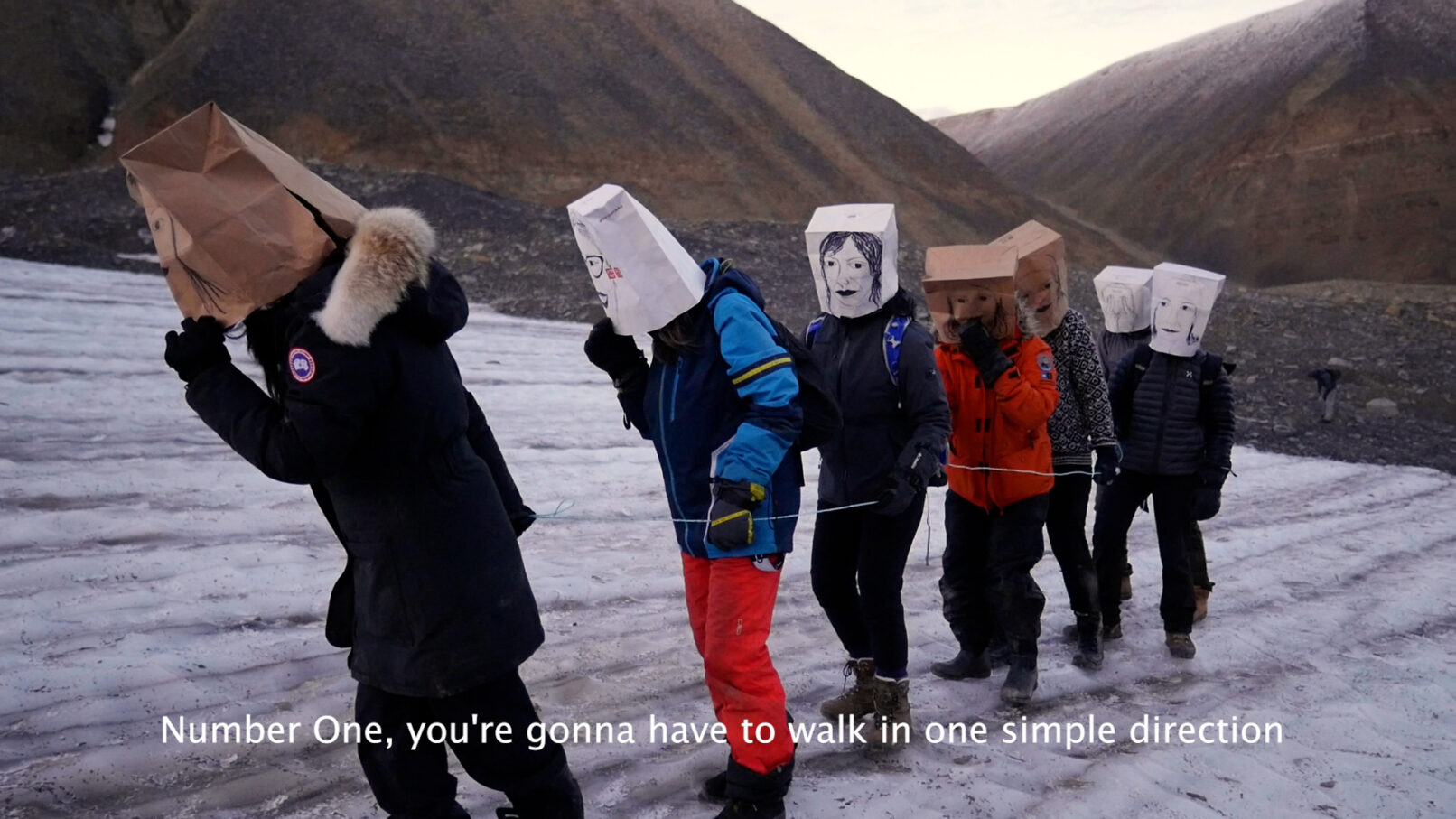 Inspired by a section in Werner Herzog’s documentary, Encounters at the End of the World, where people go through training as a team to find missing persons in preparation for extreme high arctic weather, during my Arctic Circle Residency I invited nine program members from different parts of the world to participate in the project. With paper bags placed over their heads to constrict their sight and hearing and to simulate being out in a heavy Arctic blizzard, the participants then conducted a rescue performance, in which they relied on a piece of rope to communicate and survive. The performance came to a halt when one of the participants tripped over a glacier crevasse. Just like the training documented in the film, in which they had eventually lost their way and were unable to complete the rescue, the performance, juxtaposed with the conversation in the documentary, alluded to the potential absurdity behind “modern polar expeditions.”