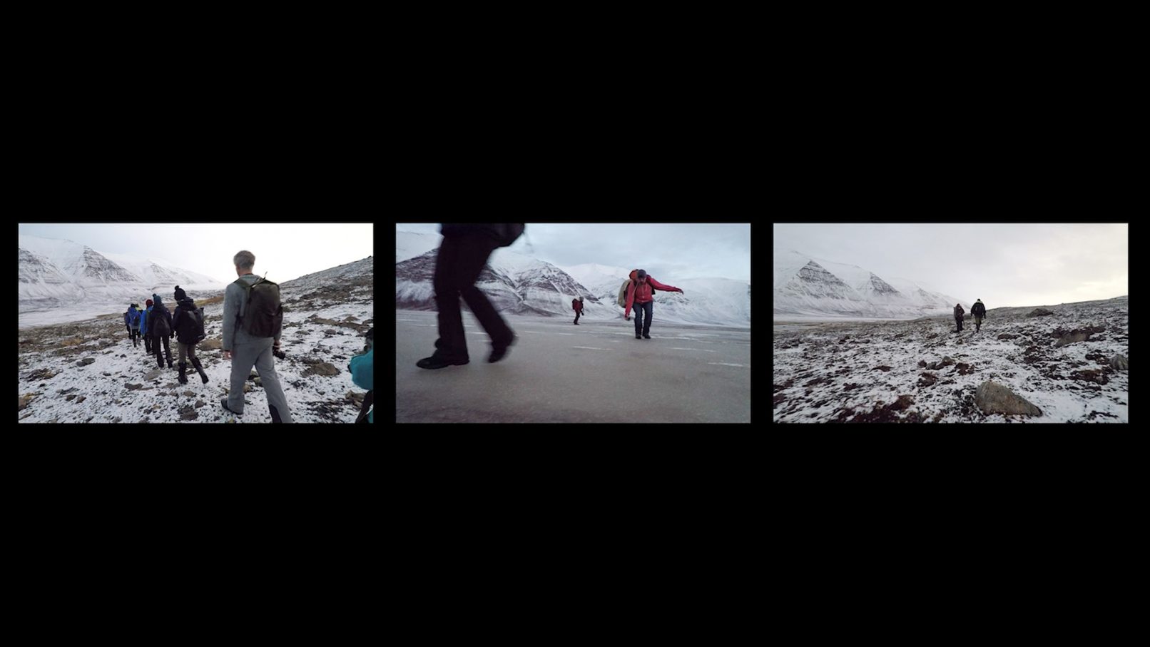 「為什麼去北方?」作品內容取材於2017年10月期間,我與來自30個來自各國與不同專業背景的成員,和10位同行的工作人員,一同參與位於北極圈內的挪威屬斯瓦爾巴群島(Svalbard),為期三個禮拜的駐村經驗。在與外界幾乎隔絕的狀態下,40為成員共同航行和生活的過程中,自成為一個小型的社會生態系統。每個成員的行為和反應,都牽動著全部成員的駐村經歷。此三頻錄像作品,將幾段駐村的紀錄影片段交錯呈現,內容包括:被浮冰圍住的橡皮艇上工作人員的奮戰過程、於17世紀的捕鯨場,團員如何按照指示依序前進觀察海象的情景、以及在徒步造訪世界是最北地熱區時,如何協助彼此跨越尚未完全結冰的河面的過程…等。意圖透過這些看似平凡的集體行為,展示出潛那些藏著來到北方的目的。